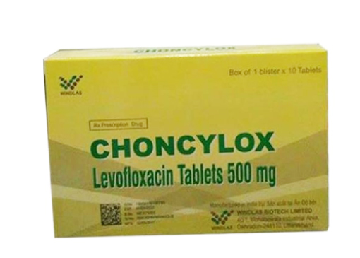 Thuốc Choncylox là Thuốc trị ký sinh trùng chống nhiễm khuẩn kháng virus kháng nấm - Số Visa thuốc / Số đăng ký / SĐK: VN-18839-15 được sản xuất bởi Windlas Biotech Ltd. - ẤN ĐỘ. Thuốc Choncylox chứa thành phần Levofloxacin (dưới dạng Levofloxacin hemihydrate) 500mg và được đóng gói dưới dạng Viên nén bao phim