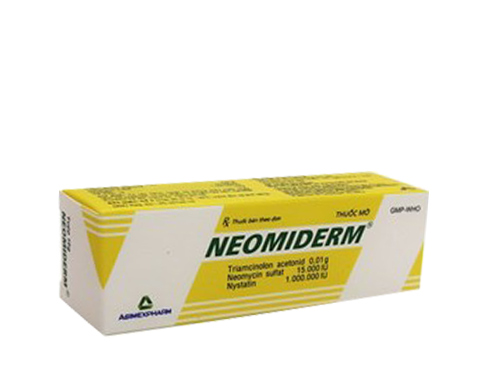Thuốc Neomiderm thành phần Mỗi 10 g chứa Triamcinolon acetonid 0,01 g; Neomycin sulfat 15.000 IU; Nystatin 1.000.000 IU dưới dạng Thuốc mỡ